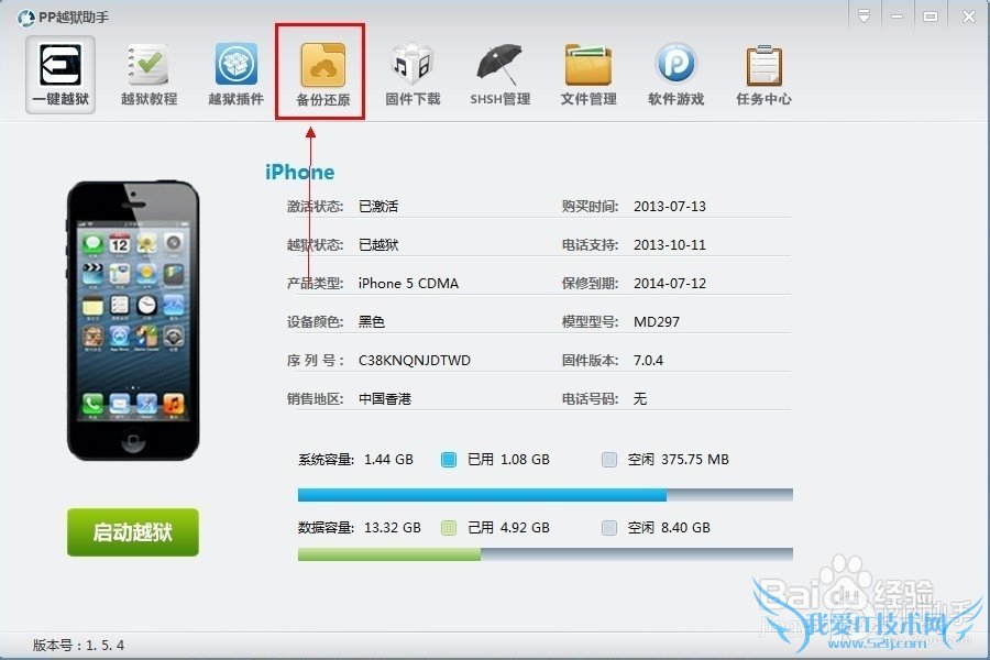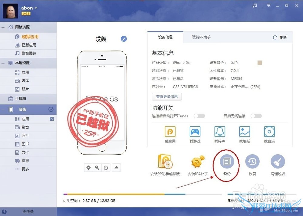 1.将设备连接至PP越狱助手,点击“备份还原”