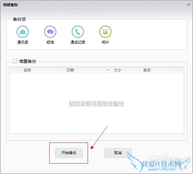 3.点击开始备份,(增量备份:原来的备份上继续备份,这个可以看是否是同一部设备的备份来自行选择操作)
