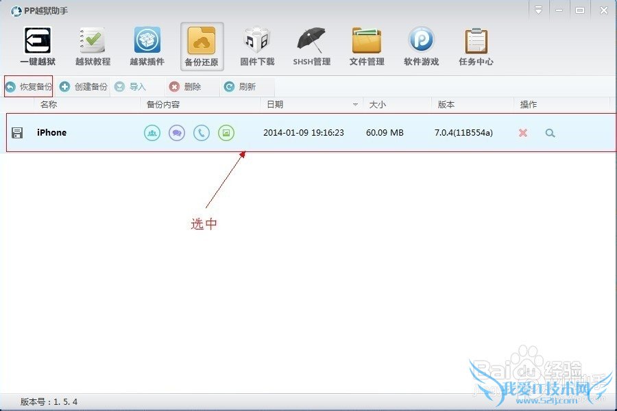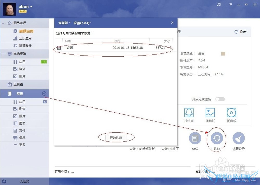 1.将设备连接电脑,打开PP越狱助手,选中需要还原的备份,点击“恢复备份”(恢复前强关闭设备上的查找我的iPhone)