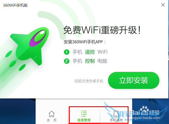 再回到电脑,看到360免费wifi有一个手机遥控的功能,这个是要安装到手机的。在弹出的安装提示界面里面可以知道只要安装该应用就可以实现控制了哟!这个我没有安装,朋友们有兴趣的话可以去试下。