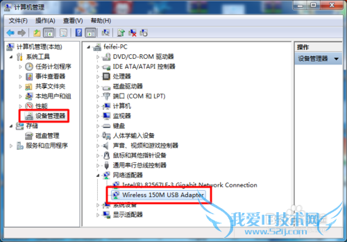 在打开的“计算机管理”窗口中,点击“设备管理器”项,就可以查看到已成功安装的无线网卡设备啦。此时表明USB无线网卡驱动正确安装。