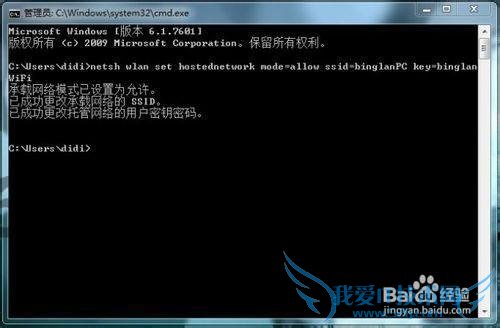 然后在已打开的命令提示符中输入"netsh wlan set hostednetwork mode=allow ssid=binglanPC key=binglanWiFi"的命令并按回车,这样就初步启用和设定了虚拟WiFi网卡。(如图3)