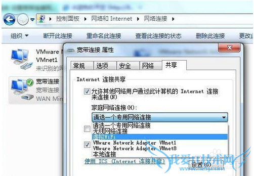 接着,就是连接Internet了。在【网络连接】中,右键单击已经连接到Internet的网络连接,依次选择【属性】—【共享】—【允许其他……连接(N)】—【虚拟WiFi】即可。而在你点击【确定】之后,那个提供共享的网卡图标旁会出现【共享】的字样。(如图4)