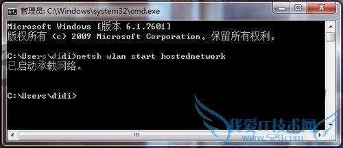 接下来,在命令提示符中运行:netsh wlan start hostednetwork,从而开启无线网络。当将"start”改为"stop"时,即可关闭该无线网络。(如图6)