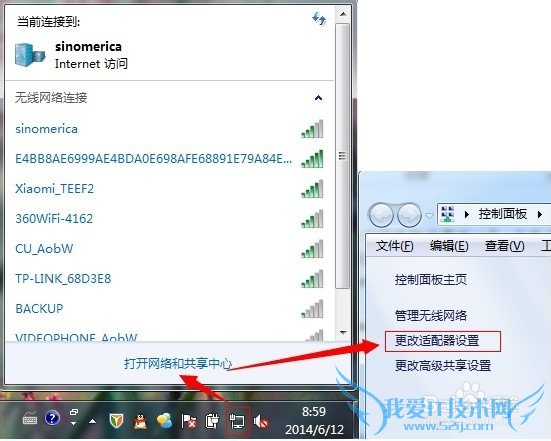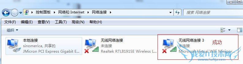 第三步、打开“网络和共享中心”,点击“更改适配器设置“,前两步成功的话,会看到一个虚拟出来的无线网络适配器。