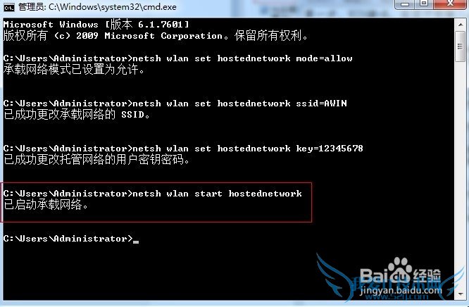 第五步、在(cmd)命令提示符中输入:netsh wlan start hostednetwork 启动搭建好的无线网络,如本例中wifi名称为AWIN,密码是1234568,手机或电脑就可以共享上网了。每次开机如果想使用的话,在cmd命令行输入 netsh wlan start hostednetwork 就可以使用自己建立的wifi网络了。