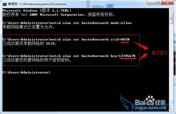 第二步、在命令提示符中输入:netsh wlan sethostednetwork ssid=wifi名称(随意),netsh wlan sethostednetwork key=wifi密码(8位以上),这一步是设置wifi名称和密码,密码必须8位以上。