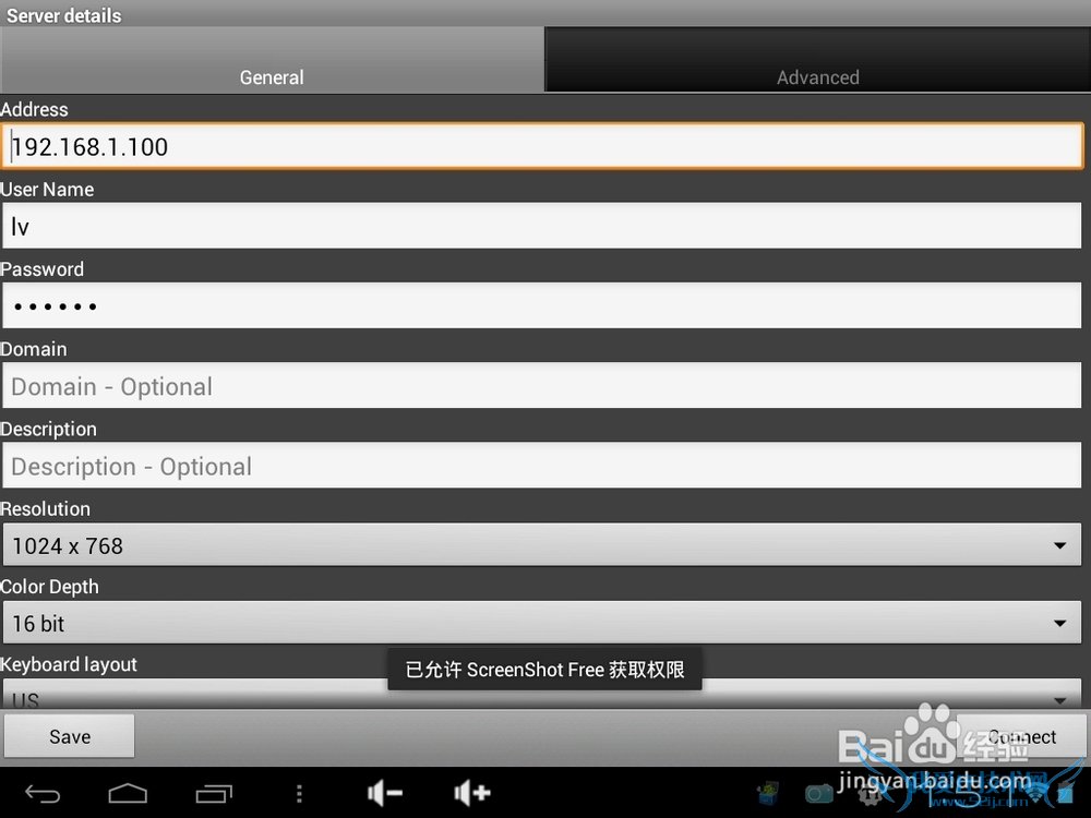 在安卓端设置远程桌面的IP和密码以及账户信息,注意该账户不能是你正在登陆的账户。比如笔者现在登陆的是名为test的账户,现在就让其连接lv账户。