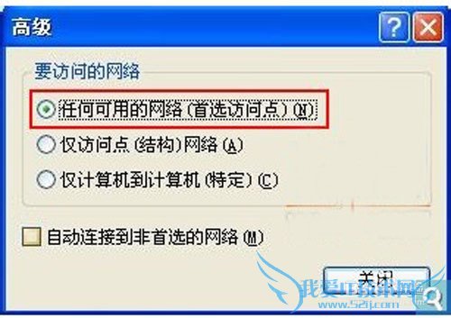6、在“高级”属性窗口我们选择“任何可用的网络(首先访问点)”切记不要勾选“自动连接到非首选的网络”