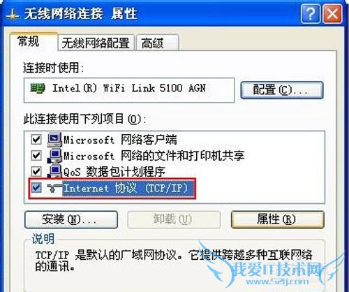 3、在“无线网络连接 属性”的窗口我们点击打钩“internet协议(TCP/IP)”然后点击“属性(R)”