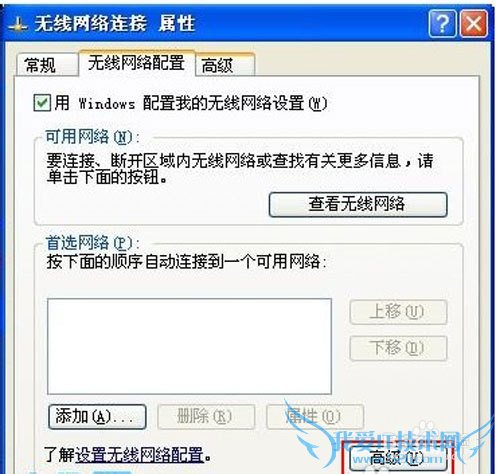 5、返回“无线网络连接 属性”窗口,选择“无线网络配置”选项然后选择“高级(V)”