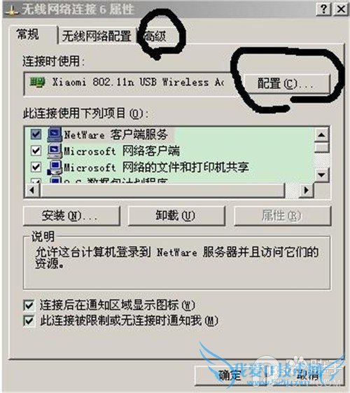 1.打开无线网络连接6的属性,点击配置;