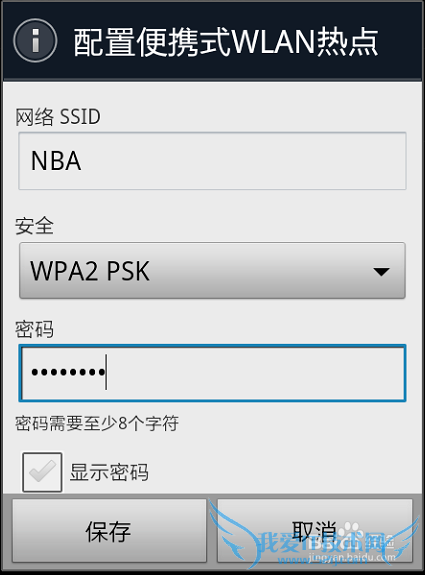 假如我所用的SSID叫NBA,密码为12345678.然后点击保存.