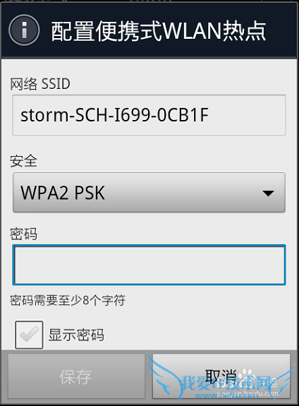 打开配置界面.网络SSID就是现实的无线网络的名字.安全下有两种模式:一种是如图所示,还有一种是公开,就是不需要密码,谁都可以连接.假如我们选择了如图所示的安全模式,那么就需要输入密码(最低8位).