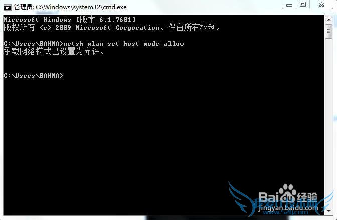 2.如果发现了无线共享的模式是禁用的问题,就再输入set hostednetwork ssid=netname(就是刚才show出来的ssid名称) mode=allow回车;