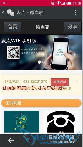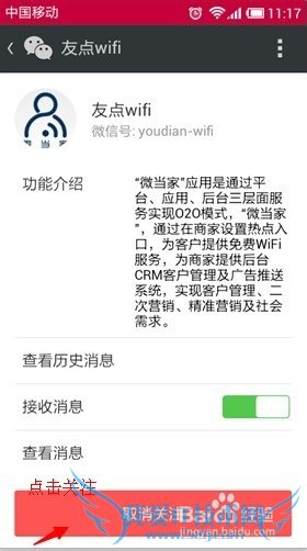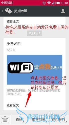 5.关注成功后会受到来自微当家微信号返回的免费wifi消息,点击该图文消息