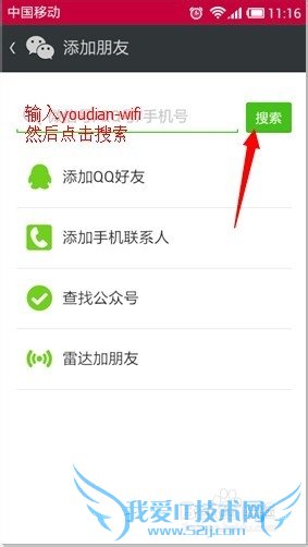 3.在添加朋友框输入微当家微信号:youdian-wifi 点击搜索