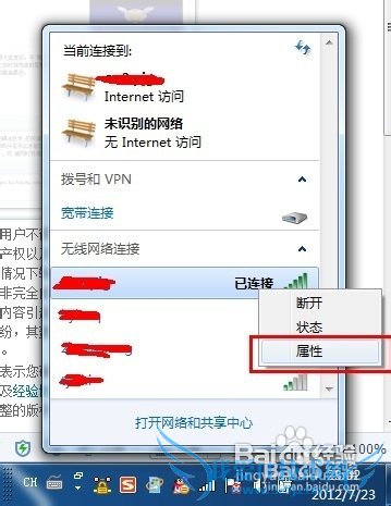 选中需要查看的无线网络连接,右键点击,在选择菜单里,选择“属性”;
