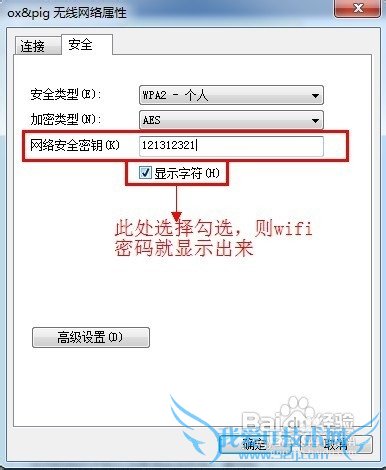 在属性窗口中,选择“安全”选项卡,然后把“显示字符”选项前面的勾打上,则此时网络密匙就能完全展示出来。