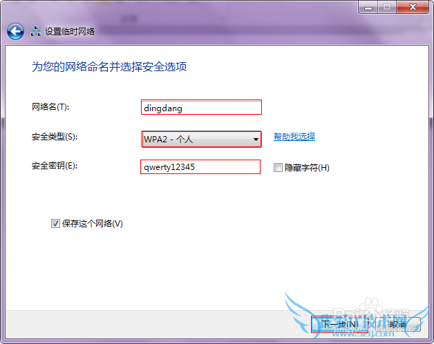 给新创建的无线网络取一个名字,然后可以设置密码。