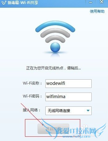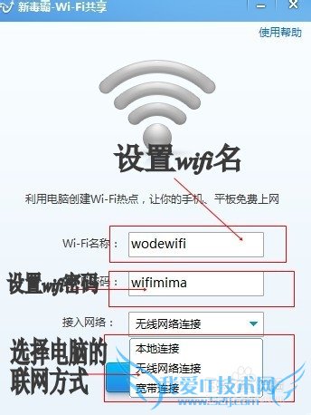 打开应用后,如下图所示:在WiFi名处填写你要设置WiFi的名字,密码处填写你要设置的密码;最下面是你电脑的联网方式:如果笔记本连的是宽带,直接选宽带就可以;如果笔记本连的是需要密码登陆的本地连接(如校园网)就选本地连接;如果笔记本连的是无线(如中国电信的WiFi,利用这种方式可以一个账号多人使用很不错哦)就选无线连接,然后开启!