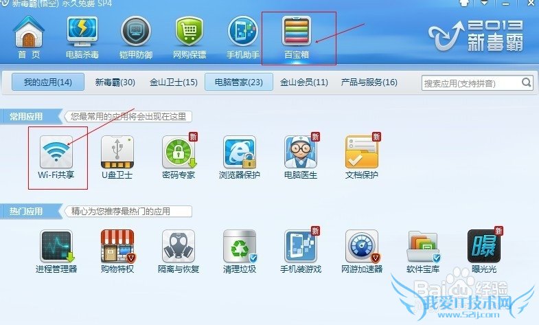 安装最新版金山毒霸软件,打开下图所示的百宝箱,在百宝箱里有个Wi-Fi共享的应用,对!就是它!单击打开这个应用。