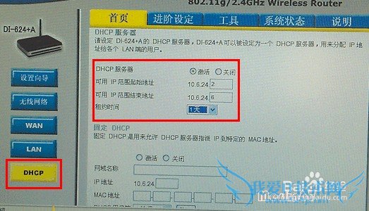 4.配置路由器“DHCP”,根据自己的规划,设置起始IP地址及结束IP地址,如:10.6.24.2—10.6.24.6;由于只是提供暂时的免费上网服务,且IP地址数有限,租约时间可以设置“1天”或更短;(这样有过多接入或流量超限时,管理员可快速查询处理)