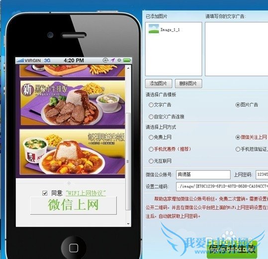 广告模板有文字广告、图片广告、视频广告等,上网验证方式有免费上网、微信关注上网、手机短信验证上网等,左边可以实时出现广告效果图,推荐微信验证帮助商家积累微信粉丝,手机优惠卷可以准确换取用户手机号。