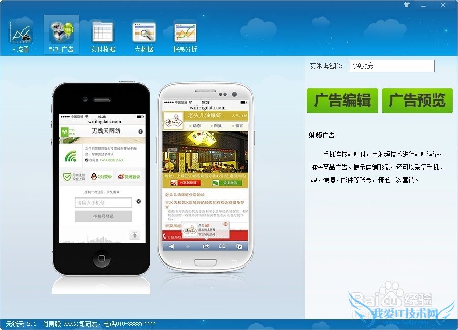 注意:只有当手机连接WiFi的时候,才弹窗WiFi认证和广告,广告效果极佳。最佳测试机型:三星、苹果、联想、中兴、诺基亚手机,这些手机“重新连接WiFi”后,如果没弹窗广告或者登录提示,请立刻打开手机的上网浏览器,如果出现广告页面,就正常!