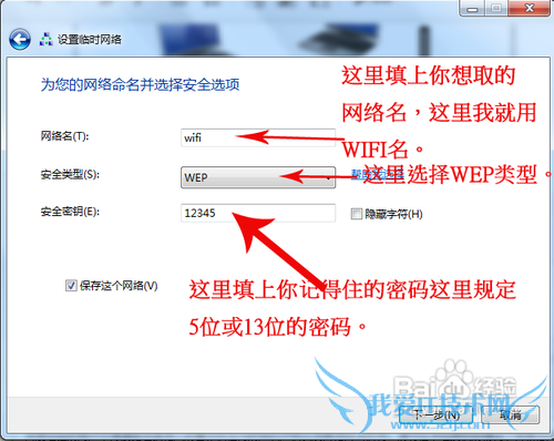 6.在设置临时网络窗口里,填上网络名,安全类型在下拉列表里选择 WEP 安全类型。然后在安全密钥里填上你的密码;密码最好是规定的5位或13位。不知道鼠标放在安全密钥空格内会有提示。填好后选择下一步。