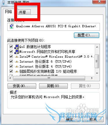 点击共享出现下图。在“允许其他网络用户通过此计算机的internet连接来连接”方框内打钩,