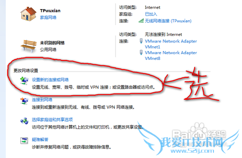 在“家庭网络连接”下拉选项里选择无线网络连接。如两图。