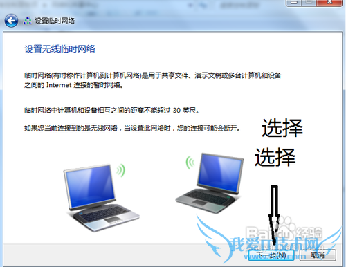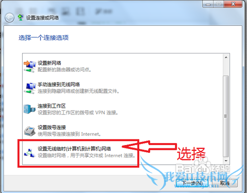 4.选择“设置无线临时(计算机到计算机)网络”并点击下一步。如图: