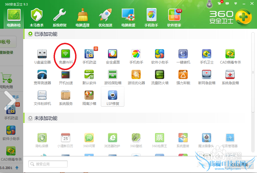 打开后在【未添加功能】处找到【免费wifi】,打击即可。然后会自动将免费wifi添加到【已添加功能】处。