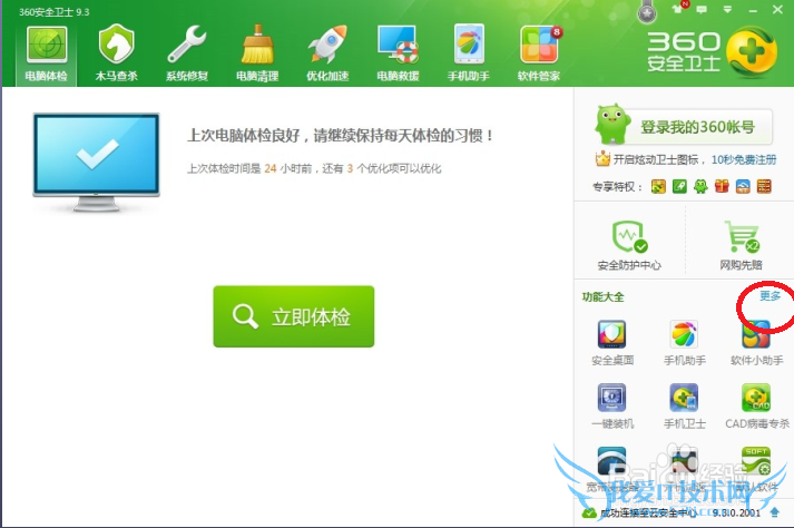 打开360安全卫士,在右侧功能大全处单击【更多】,弹出更多的360功能。