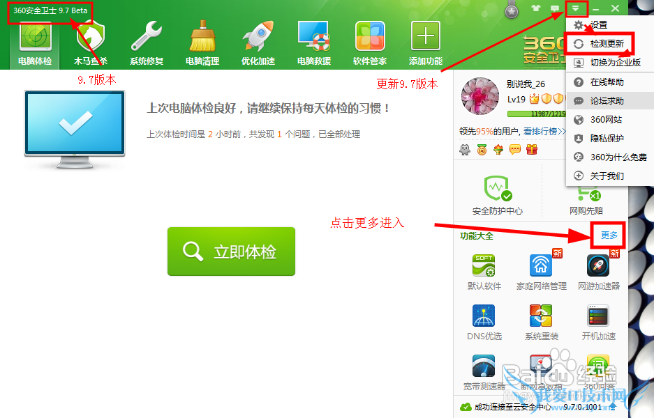 安装360安全卫士并打开,360安全卫士 9.7版本。 如果不是9.7请更新。9.6也可以点击更多即可。