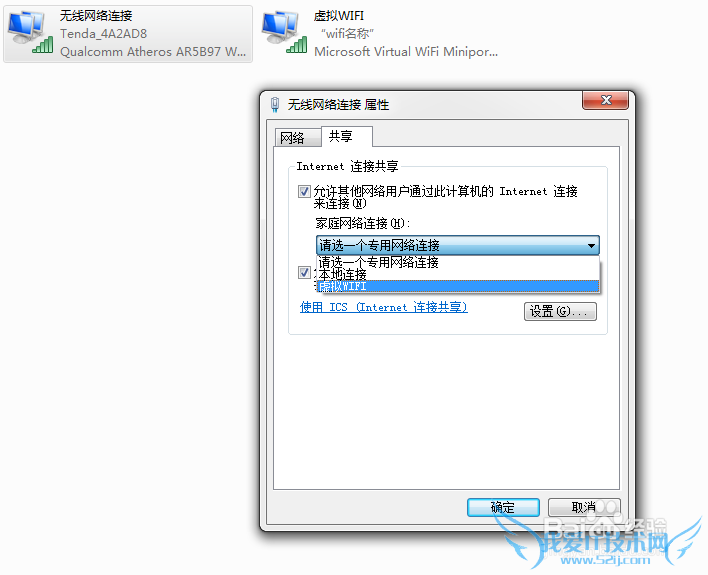 右击已连上的网络,单击“属性”,进入面板后,点击“共享”,勾上“允许其他网络用户通过此计算机的Internet连接来连接(N)”,并选上“虚拟WIFI”,单击“确认”。