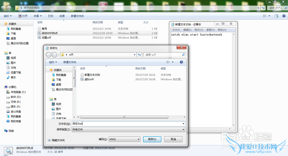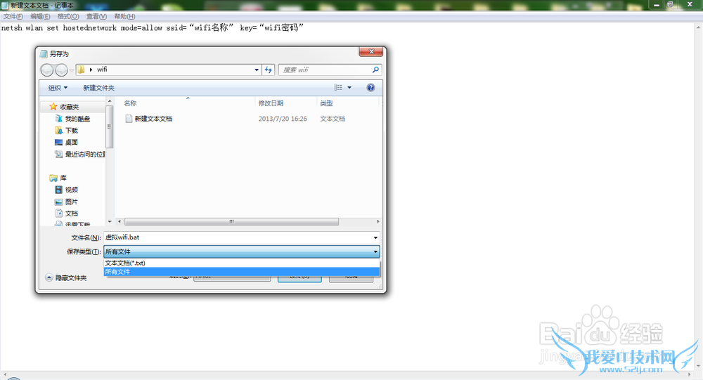 点击“文件”→“另存为”;文件名可设为“虚拟wifi.bat”,文件类型选择为“所有文件”。(记住,后缀名要设为“.bat”)