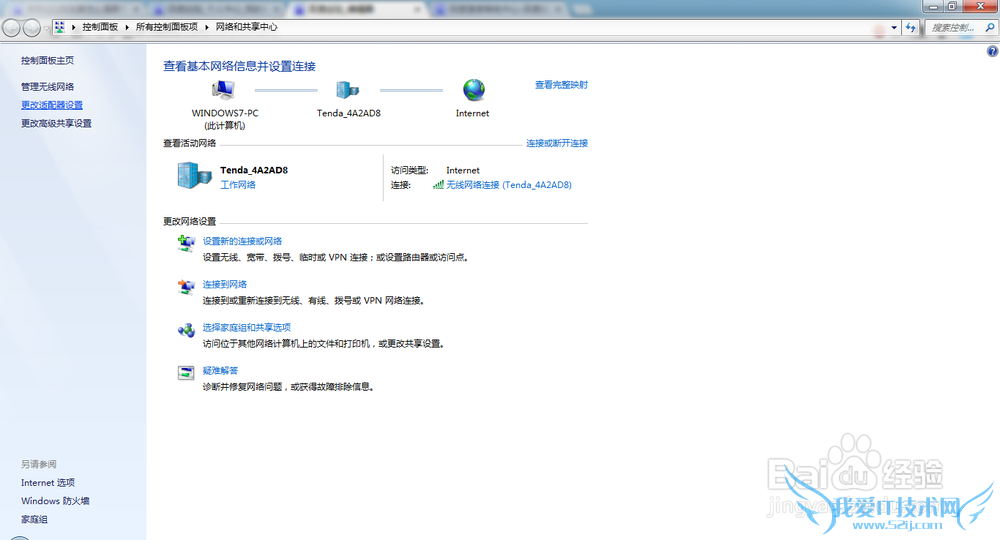 打开“网络和共享中心”,点击左侧的“更改适配器设置”。