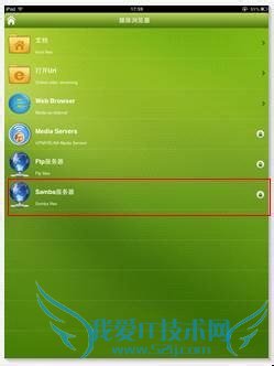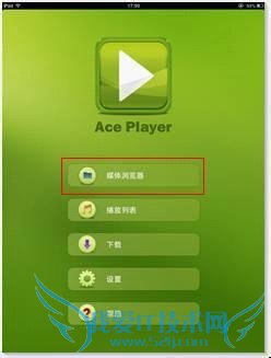 2、在iPad2上运行应用程序“AcePlayer”,选择“媒体浏览器>>Samba服务器”;