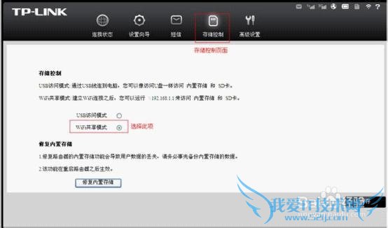 2、计算机登陆TL-TR7612000L的管理界面(http://192.168.1.1),在“存储控制”页面选择“WiFi共享模式”,点击保存。