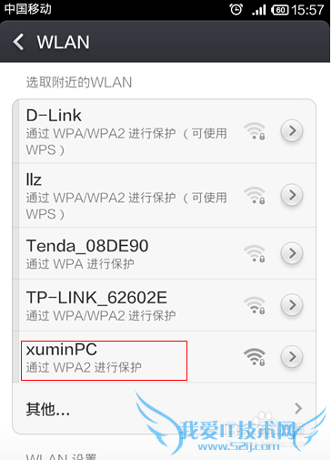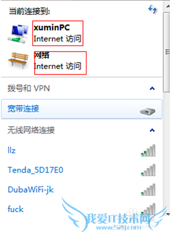 第五步:检验是否成功配置。点击桌面下边的任务栏中的“网络”,会发现进行Internet的连接有两个。说明成功配置。这时候在手机等设配上都能搜索到xuminPC这样的WALN无线网络。