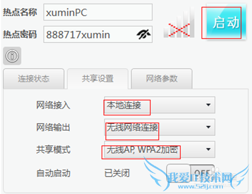 第四步,启动,设置WiFi共享精灵。点“击共享设置”选择下面红色框框的现象后点击启动。几秒后会启动成功。