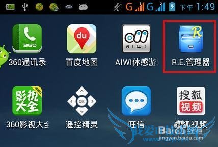 1.准备工作,首先前提就是我们的手机必须先获取root权限(怎么获取root在我分享另一篇文章里,不会的盆友们记得去看哦),然后需要我们下载一个“RE文件管理器”(百度应用里就有哦,不知算不算是给百度打广告那,哈哈,怕)。