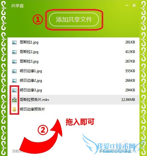 ②将视频和图片直接拖入共享盘即可。视频亦可放入文件夹后再拖入共享盘。(首选)