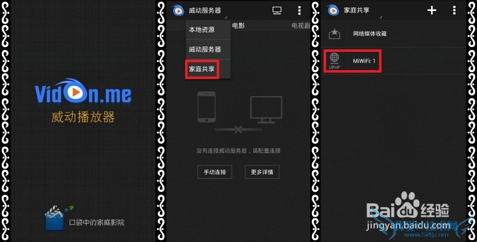 为了能流畅播放视频和浏览图片,在手机上安装威动播放器(平板亦可),选择“家庭共享”选项,威动播放器能自动搜索小米随身wifi。