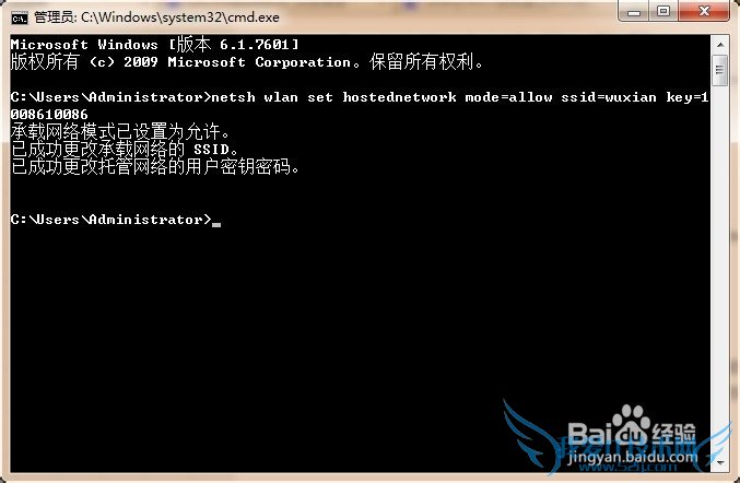 第三步:在黑色的弹出窗口中输入【netsh wlan set hostednetwork mode=allow ssid=wuxian key=1008610086】