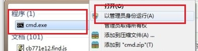 第二步:在搜索栏中输入cmd后找到cmd.exe,在cmd.exe上右键【以管理员身份运行】。如下图