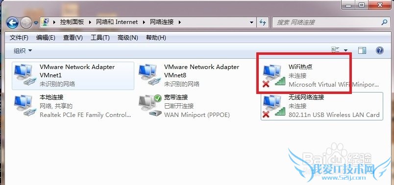 进入【更改适配器设置】里面就会发现多出了一个网卡为【Microsoft Virtual WiFi Miniport 】的无线网络连接,在该链接上右键-----重命名为【WiFi热点】方便记忆。而另一个【802.11n *********】的不需要更改它。
