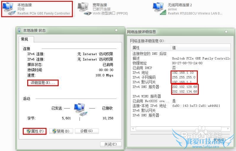 其次、更改适配器设置,可以看到本机所有的网卡,可以右键单击网卡,进行禁用或启动,也可以对某个网卡进行下面所讲的配置查看或更改,查看网络配置可以双击网卡->详细信息,查看IP、网关、DNS等主要配置。